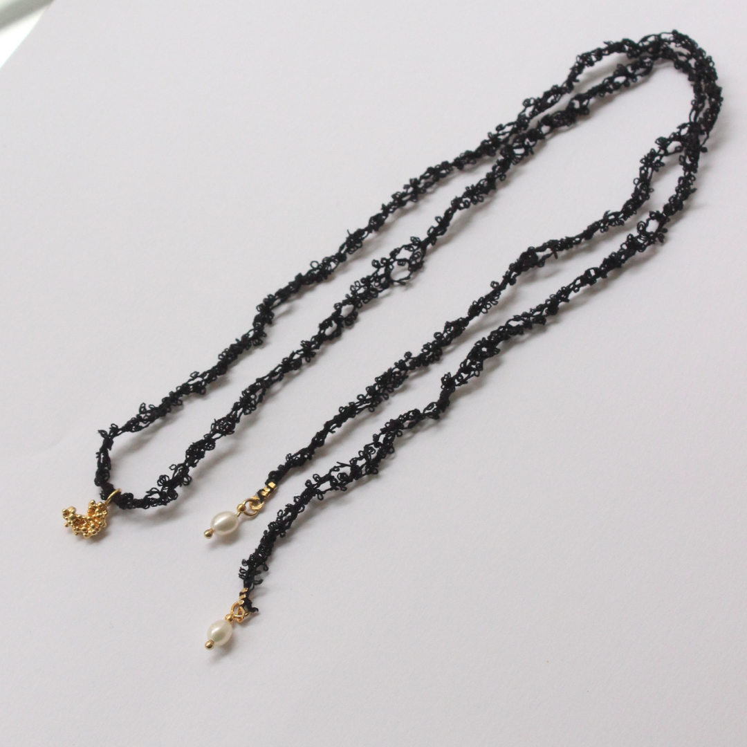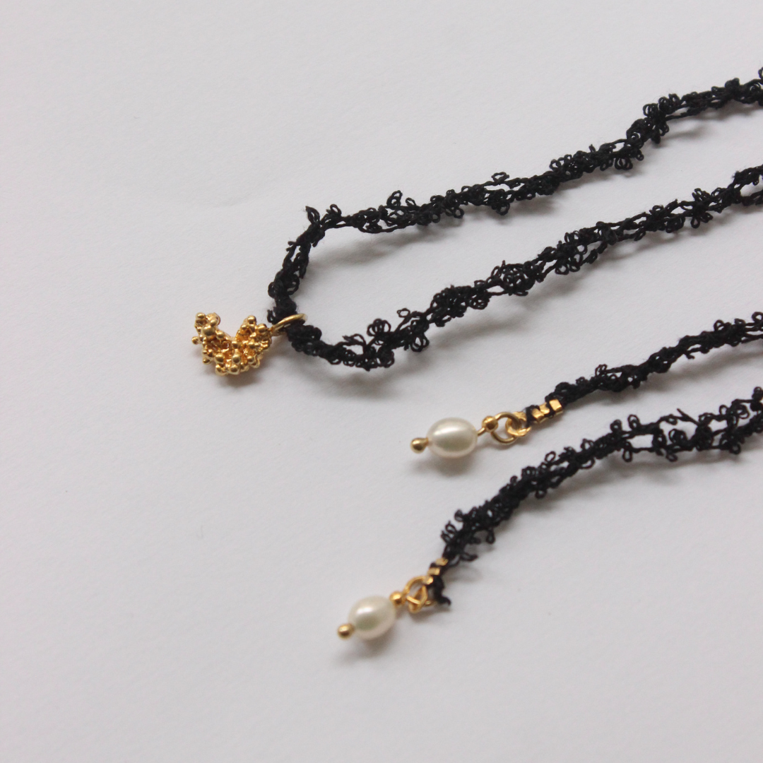 Heart-shaped pendant inspired by natural coral textures, paired with a hand-braided black silk cord and finished with freshwater pearl drops at the ends. Lightweight yet durable, the combination of gold, silk, and pearls adds a refined, handcrafted touch.