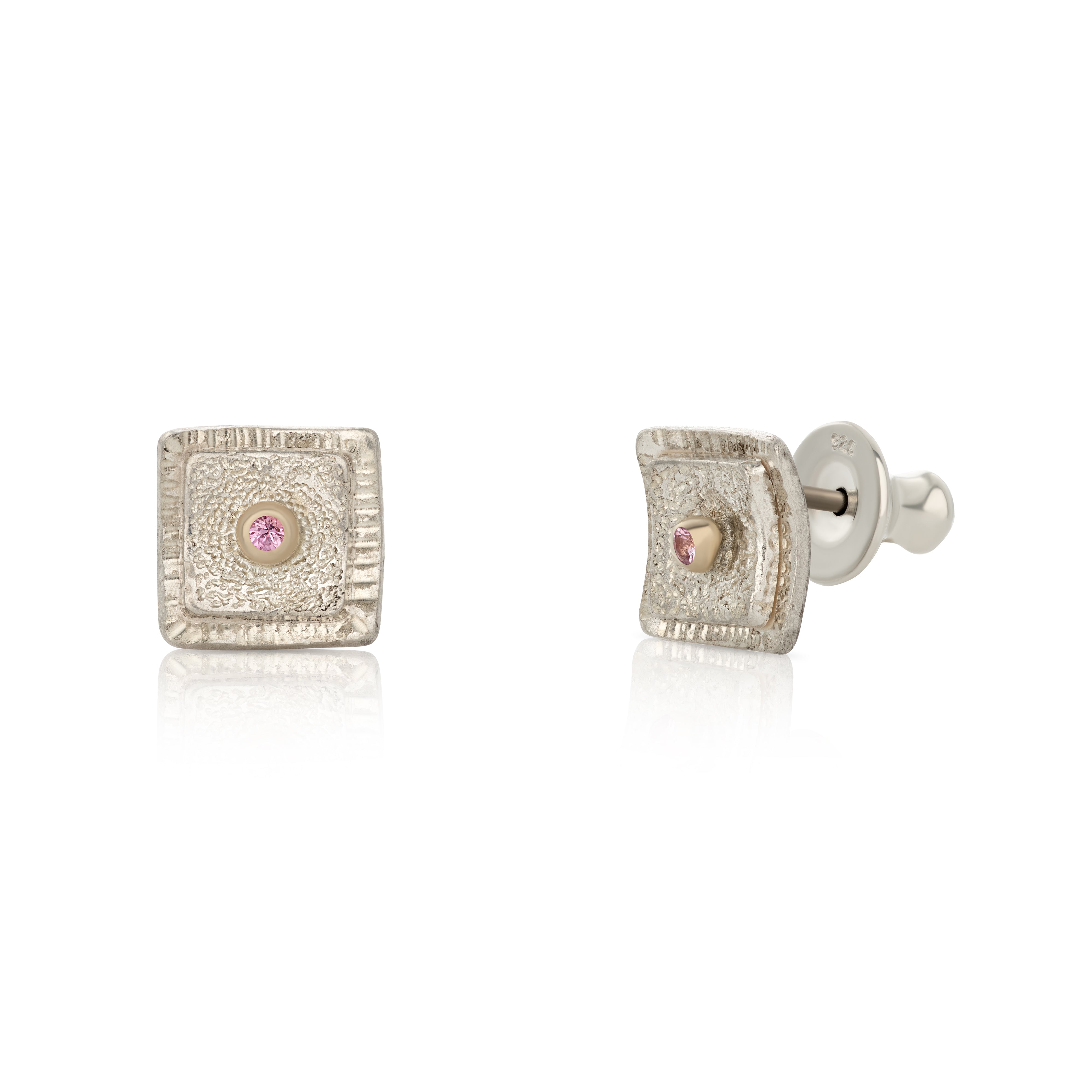 Vibrant and unique earrings made from silver and adorned with two precious pink sapphires. Handmade by jeweler Ramunas Bil. Please note that texture and proportions may be slightly different and unique.