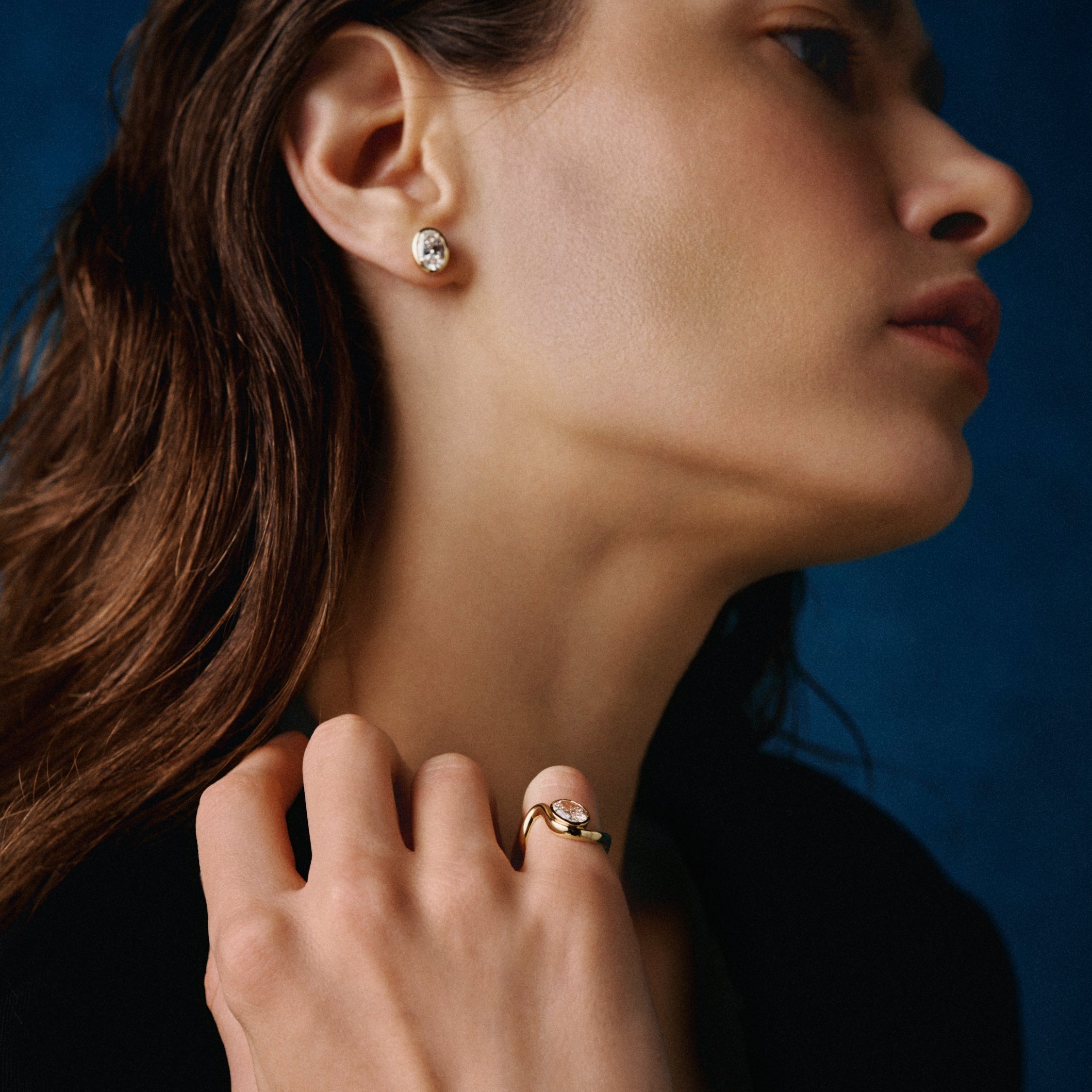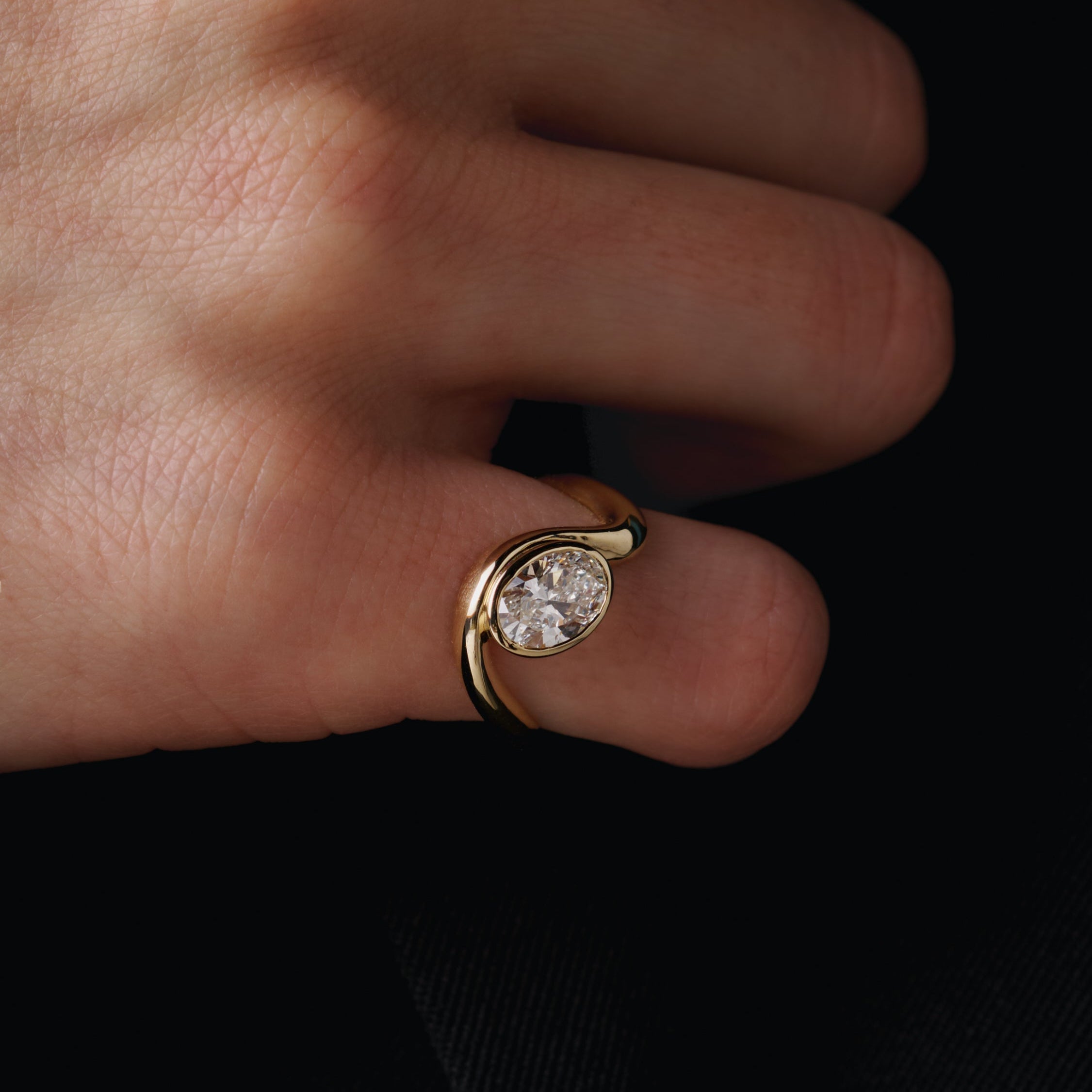 Rankomis išskulptuotas, geltono aukso žiedas, kurio juosta kyla kaip bangos ketera aplink 1 karato ovalo formos deimantą. Stiprus, bet jautrus, žiedas perteikia jūros ritmą – sklandžios kreivės išlaiko šviesą, kuri stabilizuoja ir suderina.