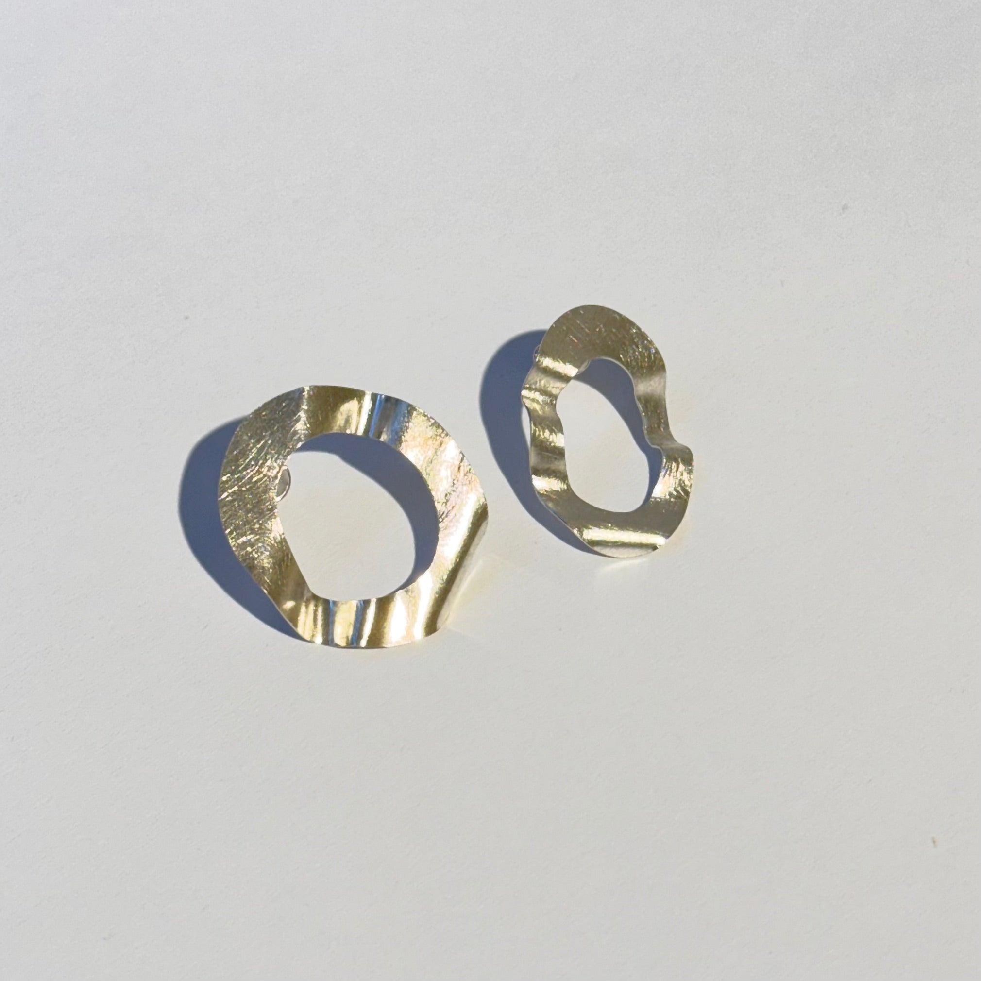 Plokščios, asimetriškos ovalo formos sidabriniai auskarai su švelnia, matine tekstūra.