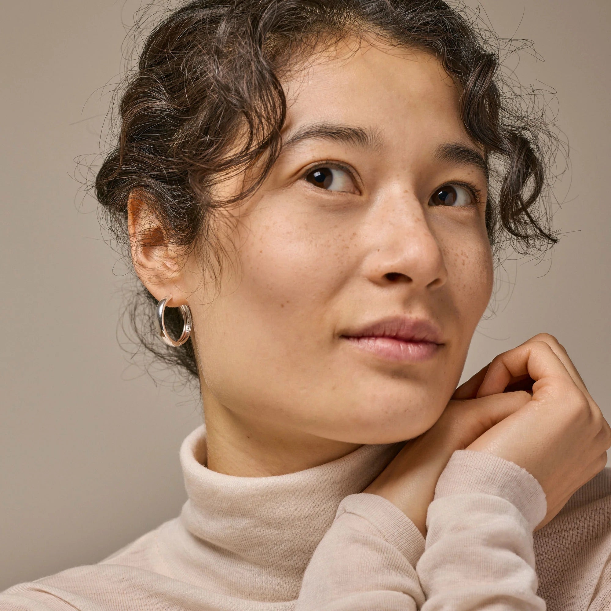 Šie auskarai – tai šiuolaikiška, santūriai išraiškinga klasikinio dizaino interpretacija. Dėl didesnio pločio auskarai suteikia švelnų akcentą įvaizdžiui, tačiau išlieka universalūs ir tinkami tiek kasdienai, tiek ypatingoms progoms.