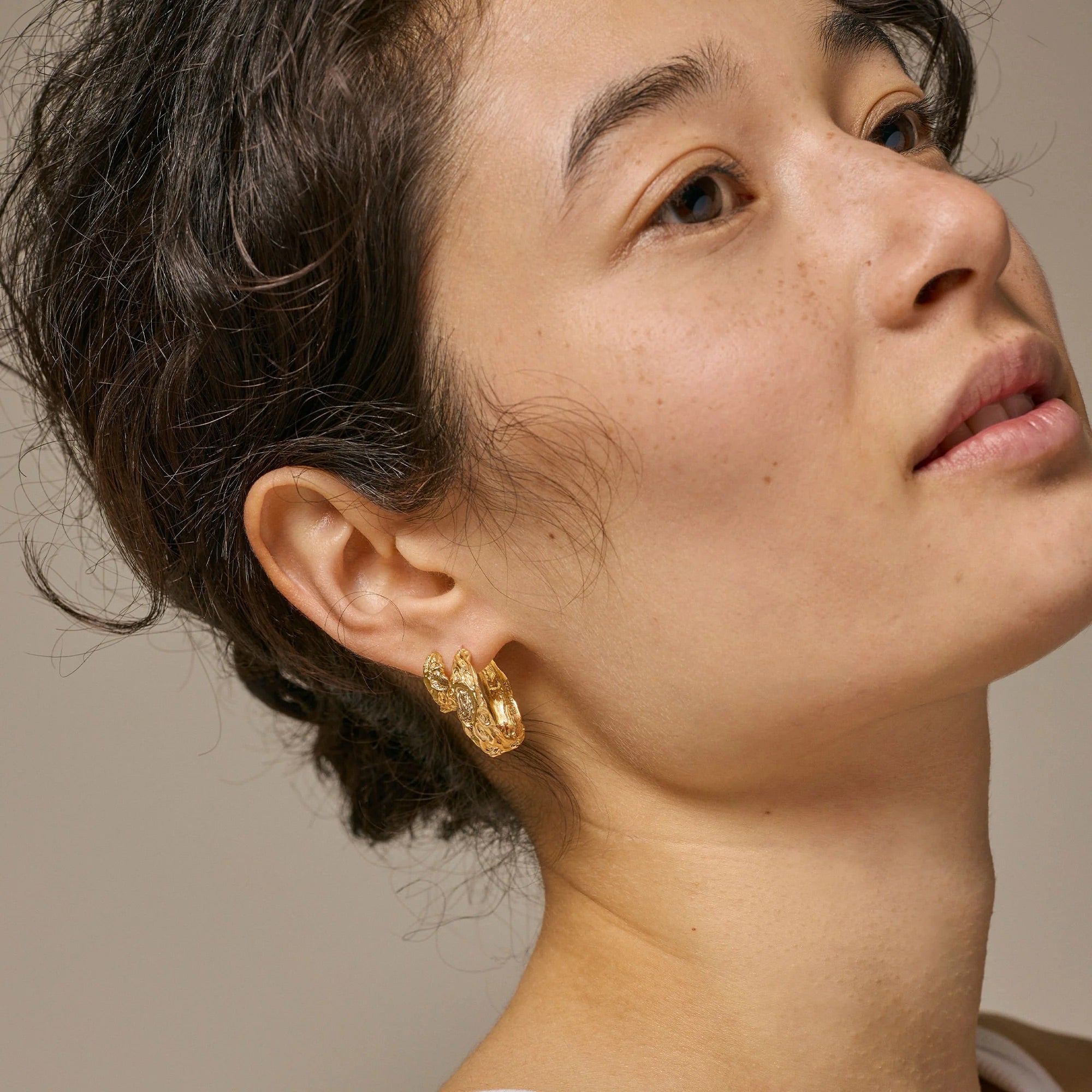 Paprasto, tačiau itin kruopščiai detalizuoto dizaino auskarai. Dėl grubaus paviršiaus bei stambaus tūrio šie auskarai puikiai tiks vieni arba suderinti su kitais auskarais.
