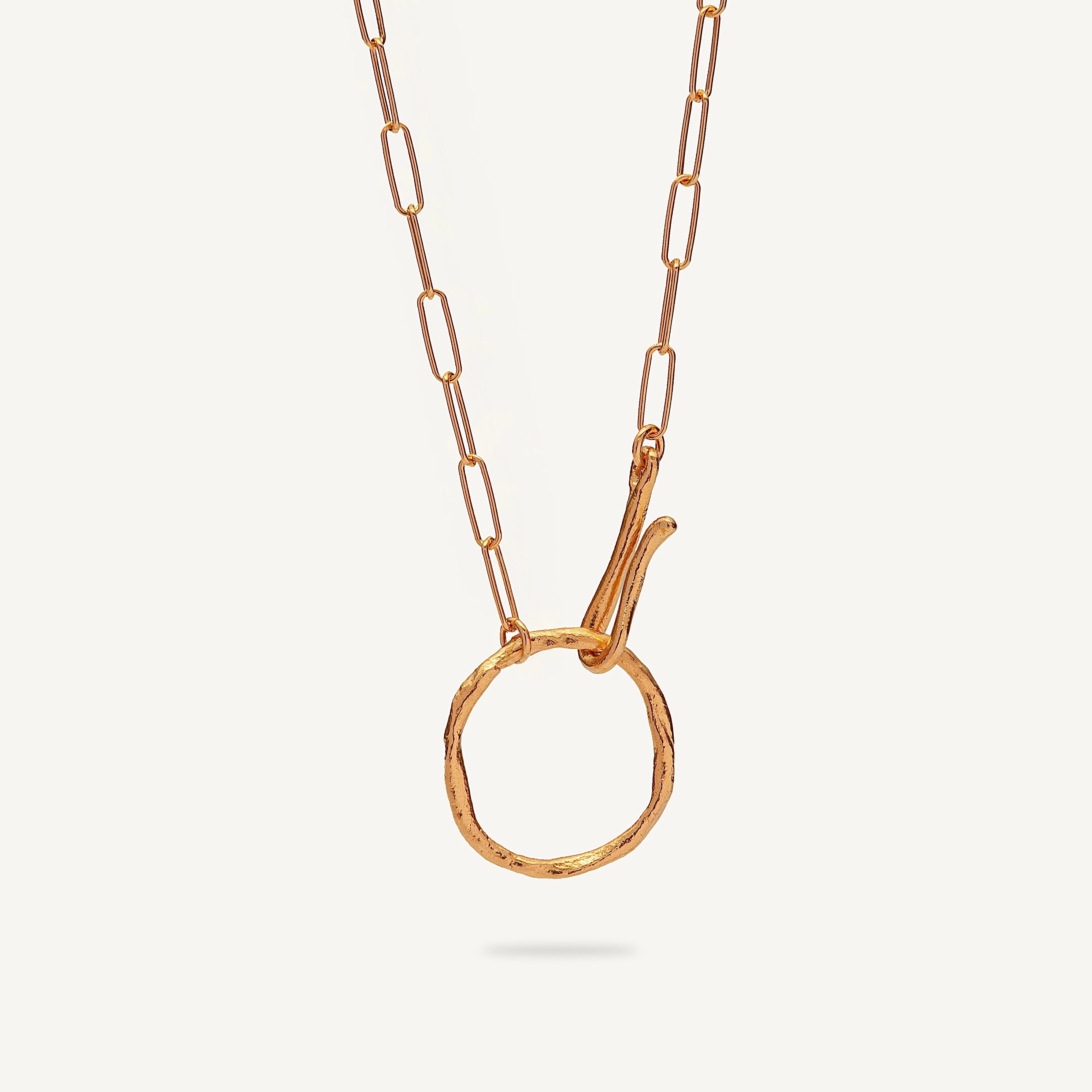 Auksuoto sidabro kaklo papuošalas, kurio akcentas – tekstūruotas apvalus pakabukas.